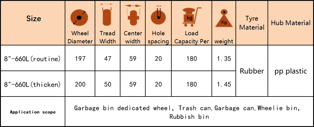 | Application scope | Garbage bin dedicated wheel,Trash can,Garbage can,Wheelie bin,Rubbish bin |